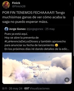 Día 25 de mayo: Comienza la preventa de La herencia de los dioses para hacerse con un ejemplar firmado, dedicado y con regalos exclusivos. Se anuncia su fecha de lanzamiento.